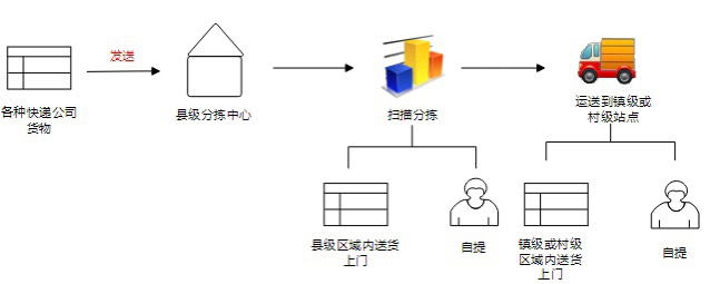 農(nóng)戶或農(nóng)企將其他村鎮(zhèn)所需貨物送到村級或鎮(zhèn)級站點(diǎn),村級或鎮(zhèn)級站點(diǎn)進(jìn)行錄單收件,打印自有品牌快遞面單,通過共配車并將貨物發(fā)運(yùn)到縣級分撥中心??h級分撥中心收到快遞后進(jìn)行到件掃描,如果快遞目的地是縣級城區(qū)內(nèi)的,通知收件人收件或送貨上門。如果是鎮(zhèn)或村級區(qū)域的快遞,則將發(fā)往同一鎮(zhèn)或村級站點(diǎn)的快遞進(jìn)行打包,通過共配發(fā)運(yùn)到鎮(zhèn)或村級站點(diǎn),鎮(zhèn)或村級站點(diǎn)接收到快遞后進(jìn)行到件掃描,并通知收件人收件或送貨上門。