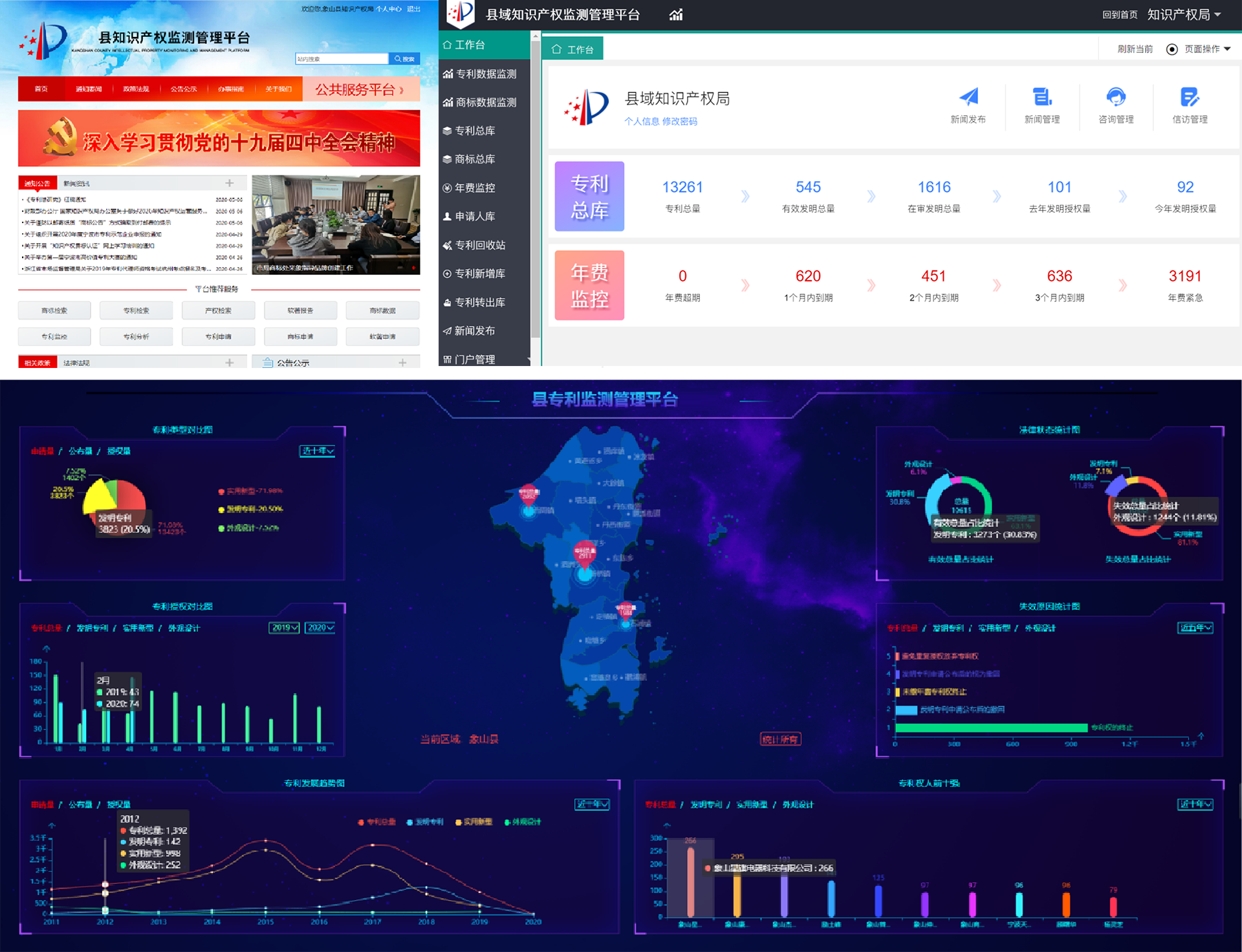 知識(shí)產(chǎn)權(quán)公共服務(wù)系統(tǒng)通過(guò)現(xiàn)代化電子網(wǎng)絡(luò)手段,為企業(yè)免費(fèi)提供專利總量、專利排名、專利類型對(duì)比圖等在內(nèi)的快速數(shù)據(jù)查詢通道,讓企業(yè)切實(shí)享受到快捷準(zhǔn)確的全方位服務(wù)。該平臺(tái)設(shè)有專利信息檢索、專利交易信息發(fā)布與收集、專利監(jiān)管等模塊,可以實(shí)現(xiàn)對(duì)全縣發(fā)明專利的全方位動(dòng)態(tài)監(jiān)測(cè)。還設(shè)有一鍵繳費(fèi)到期預(yù)警功能,可通過(guò)系統(tǒng)后臺(tái)推送提醒企業(yè),預(yù)防企業(yè)因超期或漏繳年費(fèi)造成的專利流失,全面提升政府公信力和監(jiān)管時(shí)效性。