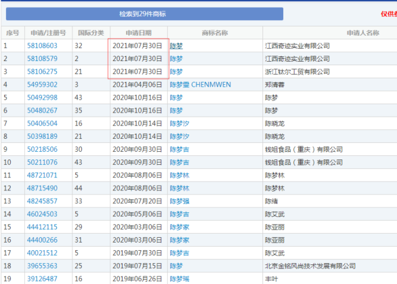 其實,每屆奧運會后總會爆發(fā)商標搶注的風波。雅典奧運會劉翔奪冠后,“飛人劉翔”、“劉翔跨越”等劉翔相關(guān)商標被多家公司及自然人申請注冊,國際分類涉及服裝鞋帽、健身器材、珠寶鐘表等。倫敦奧運會“葉詩文”奪冠后,一個月內(nèi)其姓名作為商標被申請多次,目前商標狀態(tài)多為“商標無效”。林書豪的綽號“林瘋狂”、“林旋風”等也被搶注商標,傅園慧相關(guān)熱詞“洪荒之力”也有上百條商標信息。