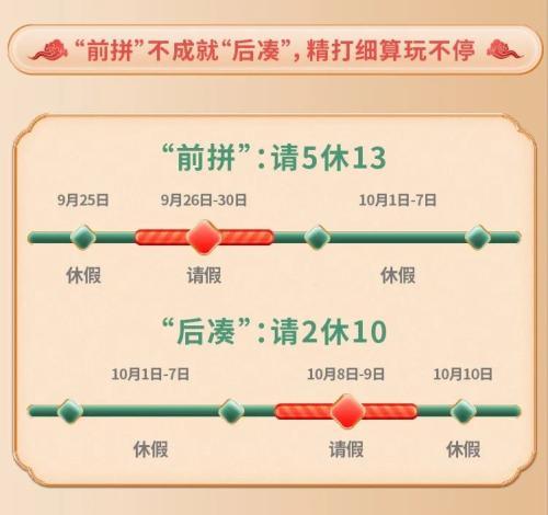 鑒于今年中秋和國慶假期具有一定時間間隔,且受調(diào)休安排影響,“拼假族”國慶長假的打開方式以“后湊”為主,大部分“拼假族”更傾向于在10月8日、9日請假2天,連接10月10日(星期日)和國慶7天公休日,就可以連放10天假。部分有更長期休閑度假計劃的“打工人”則采用“請5休13”的策略,即9月26日至30日(5天)請假,加上9月25日(星期六)和國慶假期,便能收獲13天的超長假期。
