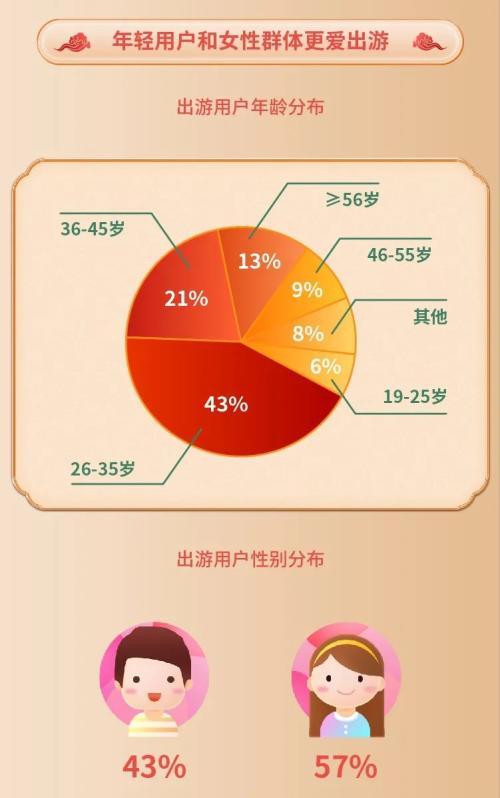 在游客年齡分布方面,中青年依舊是國慶出游的主力軍,有43%的出游用戶年齡在26-35歲之間,36-45歲的出游用戶占比也達(dá)到了21%。此外,相比于男性群體女性群體更愛出游,國慶假期途牛旅游網(wǎng)女性出游用戶占比為57%。