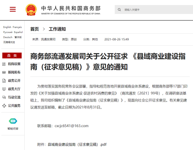 通知指出,為貫徹落實國務院常務會議部署,指導和規(guī)范各地開展縣域商業(yè)體系建設,根據(jù)商務部等17部門印發(fā)的《關于加強縣域商業(yè)體系建設 促進農村消費的意見》,在調研座談基礎上,流通發(fā)展司組織編制了《縣域商業(yè)建設指南(征求意見稿)》,現(xiàn)面向社會公開征求意見。有關意見建議請發(fā)送至郵箱cxcjc6541@163.com,截止日期為2021年8月31日。