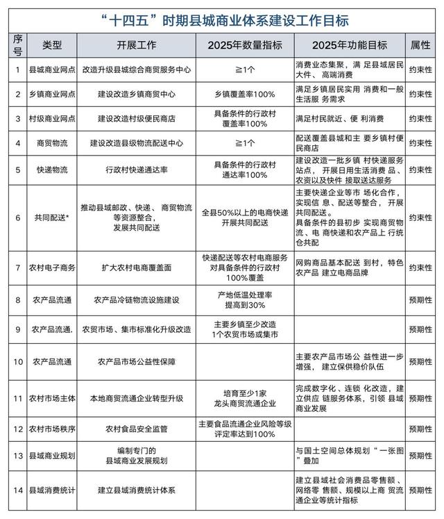 按照“在具備條件的地區(qū),基本實現(xiàn)縣縣有連鎖商超和物流配送中心、鄉(xiāng)鎮(zhèn)有商貿中心、村村通快遞”縣域商業(yè)建設行動總目標,以縣、鄉(xiāng)、村商業(yè)網(wǎng)絡和物流配送“三點一線”的建設改造為中心,同步推動縣域商業(yè)網(wǎng)點設施、功能業(yè)態(tài)、市場主體、消費環(huán)境等的全面提升。到2025年,建立以縣城為中心、鄉(xiāng)鎮(zhèn)為重點、村為基礎、分工合理、布局完善的一體化縣域商業(yè)網(wǎng)絡體系。
