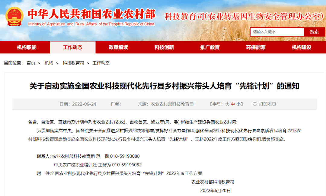 為貫徹落實(shí)黨中央、國務(wù)院關(guān)于全面推進(jìn)鄉(xiāng)村振興的決策部署,發(fā)揮好社會力量作用,強(qiáng)化全國農(nóng)業(yè)科技現(xiàn)代化先行縣高素質(zhì)農(nóng)民培育,農(nóng)業(yè)農(nóng)村部科技教育司啟動實(shí)施全國農(nóng)業(yè)科技現(xiàn)代化先行縣鄉(xiāng)村振興帶頭人培育“先鋒計(jì)劃”?,F(xiàn)將2022年度工作方案印發(fā)給你們,請參照實(shí)施。