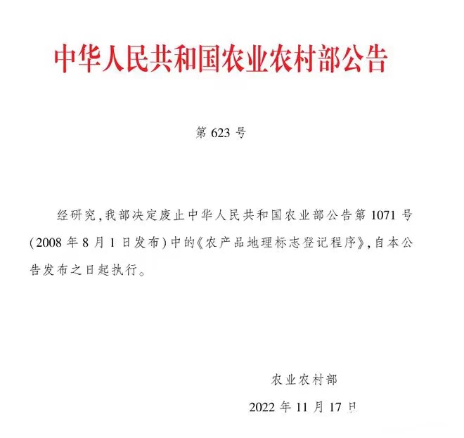 農(nóng)業(yè)農(nóng)村部第623號(hào)公告:廢止《農(nóng)產(chǎn)品地理標(biāo)志登記程序》
