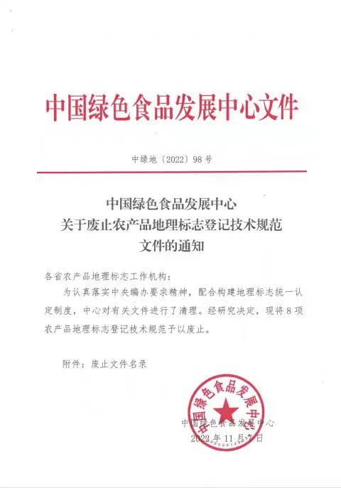 2022年11月9日,農(nóng)業(yè)農(nóng)村部信訪處答網(wǎng)民關(guān)于“農(nóng)產(chǎn)品地理標(biāo)志認(rèn)證政策咨詢”的留言時(shí)指出,“2022年3月,我部已停止了農(nóng)產(chǎn)品地理標(biāo)志登記工作,包括受理、評(píng)審、公示和公告,2022年制定的有關(guān)登記計(jì)劃也相應(yīng)停止實(shí)施”。另?yè)?jù)中國(guó)綠色食品發(fā)展中心關(guān)于廢止農(nóng)產(chǎn)品地理標(biāo)志登記技術(shù)規(guī)范的通知,將8項(xiàng)農(nóng)產(chǎn)品地理標(biāo)志登記技術(shù)規(guī)范予以廢止。