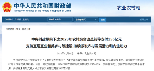 農(nóng)村綜合改革轉(zhuǎn)移支付156億元