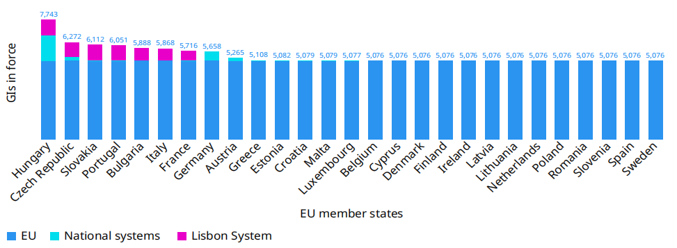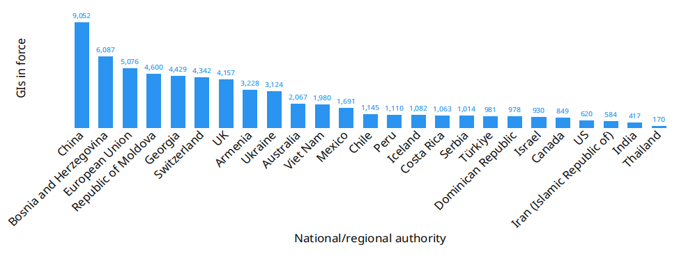 中國(guó)(9,052個(gè))報(bào)告的有效地理標(biāo)志數(shù)量最多,其次是匈牙利(7,743個(gè))、捷克共和國(guó)(6,272個(gè))、斯洛伐克(6,112個(gè))以及波斯尼亞和黑塞哥維那(6,087個(gè))。