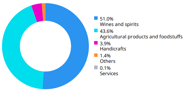 與“葡萄酒和烈酒”有關(guān)的有效地理標(biāo)志占2021年世界總量的51%左右,其次是農(nóng)產(chǎn)品和食品(43.6%)以及手工藝品(3.9%)。