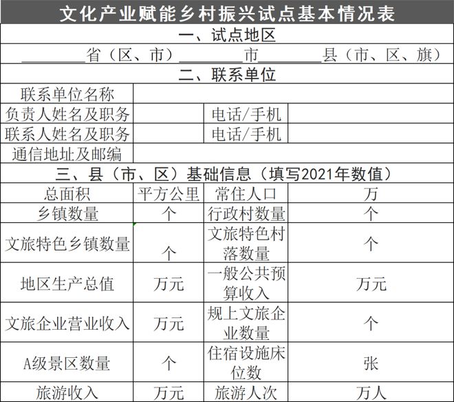 (一)試點申報主體為縣級(包括縣、縣級市、市轄區(qū)等縣級行政區(qū)劃單位)人民政府。申報主體制定試點實施方案(見附件3),填報基本情況表(見附件2),將材料報至省級文化和旅游部門。